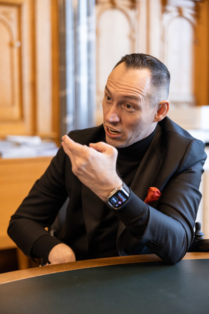 Nous sommes assis au Palais fédéral, entourés de journalistes et de parlementaires qui boivent un café, discutent et donnent des interviews. Comme nous. Islam Alijaj rit. Il est charmant et plein d’esprit. Cela se ressent, même sans les mots que son assistante vocale traduit en sons plus compréhensibles.